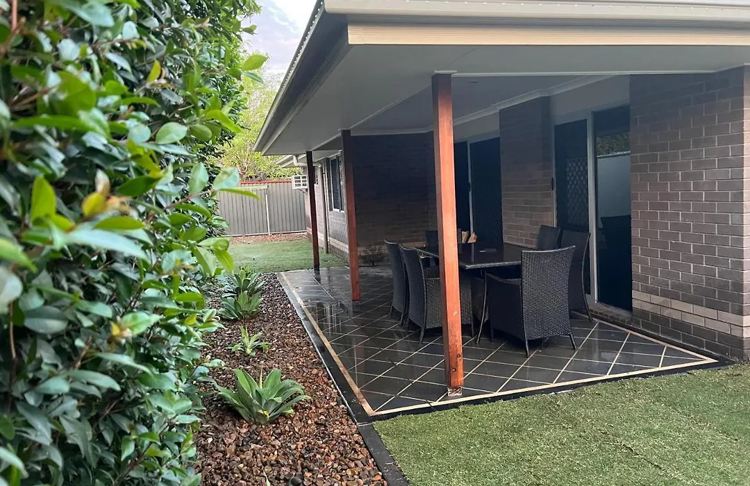 Home Away From Home - Modern Luxury In Central Bundaberg ligt op slechts 650 meter ver van St John's Lutheran Church Bundaberg en nodigt gasten uit om te ontspannen op een terras.